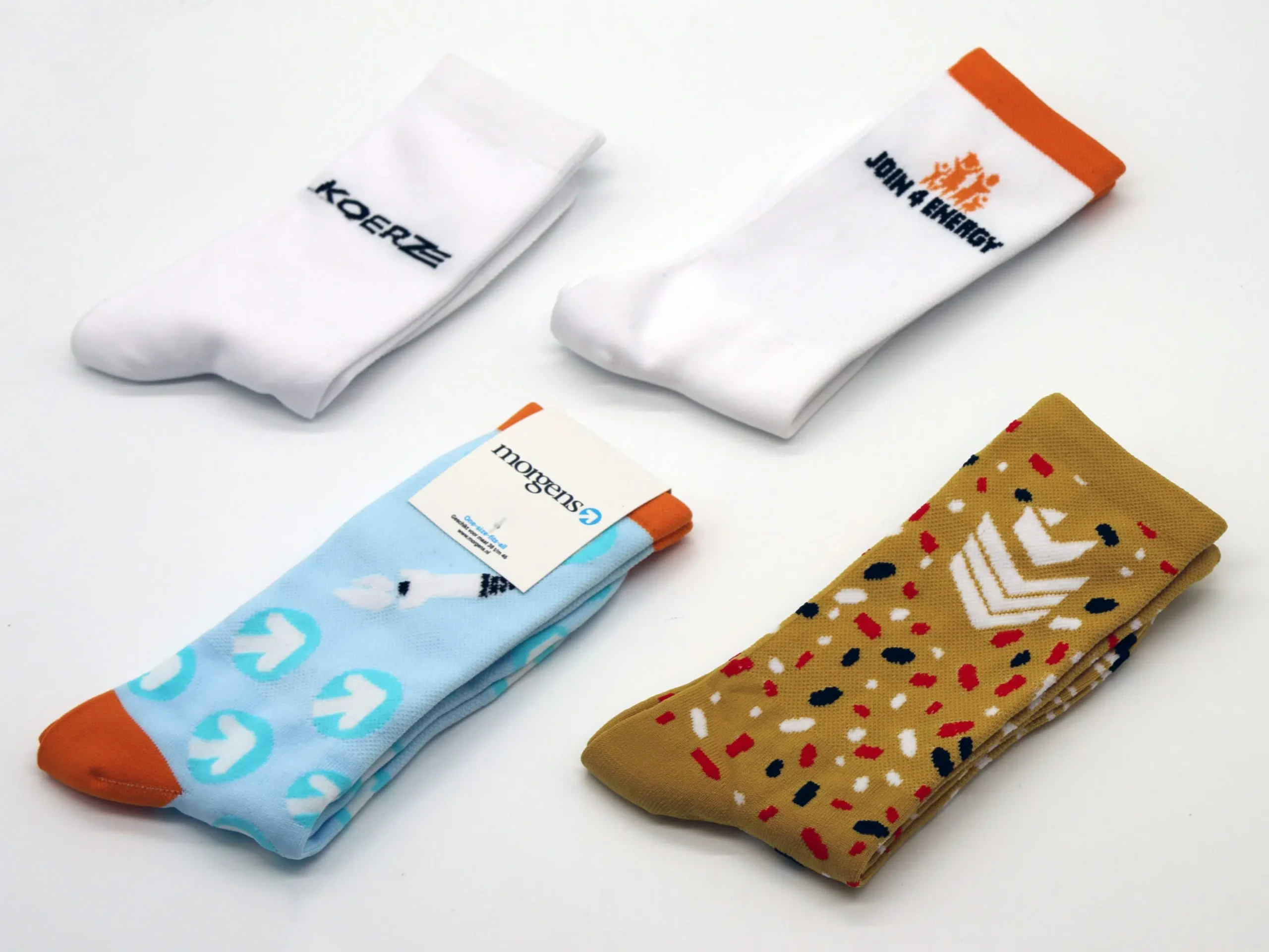 Step one is to make your wishes known. What style do we use, should your logo be prominent on the socks or subtle? Do we go for classic white cycling socks or a colourful design? Next, we will create several digital sample designs for you to choose from. Of course, the socks should radiate more than just the company logo. Experience therefore shows that somewhat cheerful socks do well, in which your logo is subtly highlighted on the socks, ideal for cycling. After concretising the design, we start producing for you.