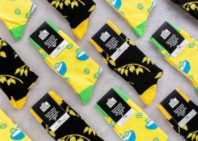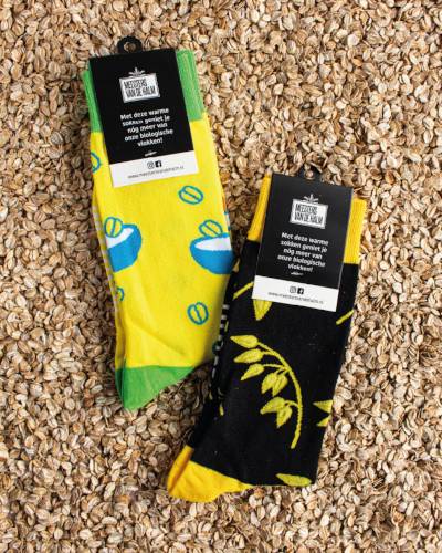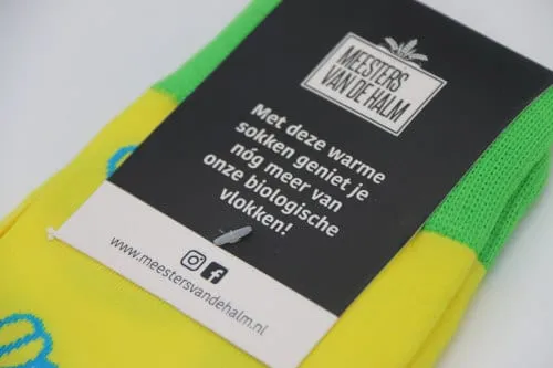 De Halm was op zoek naar sokken voor in hun webshop en als promotiemateriaal. Ze kwamen met diverse creatieve ideeën die uiteindelijk zijn omgezet naar proefdesigns. Uiteindelijk was kiezen lastig, dus besloten ze om twee designs te laten produceren. Inmiddels worden deze verkocht in de webshop en uitgedeeld aan klanten en personeel.