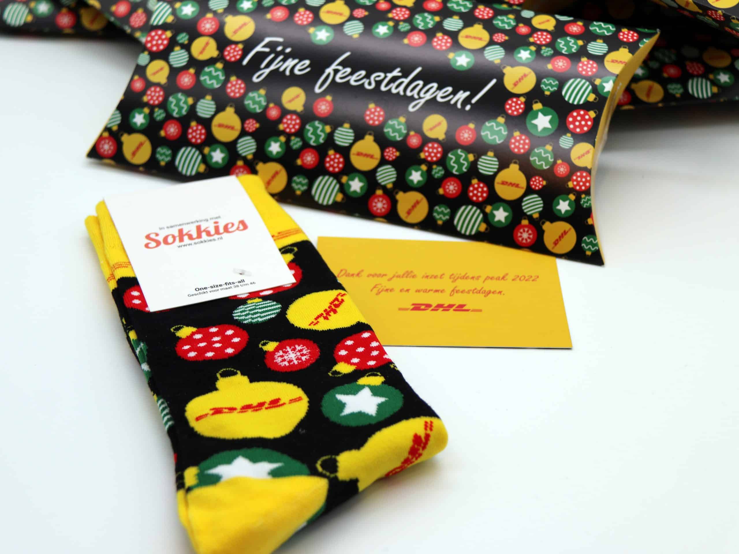 They wanted to print custom socks for Christmas. It was to be a colorful affair in the style of DHL. Characteristic in this is the bright yellow and red letters of DHL. We therefore modified the baubles design and made it match the corporate identity. The gift wrapping and accompanying Christmas message on the card is also completely DHL style. So unique Christmas socks!