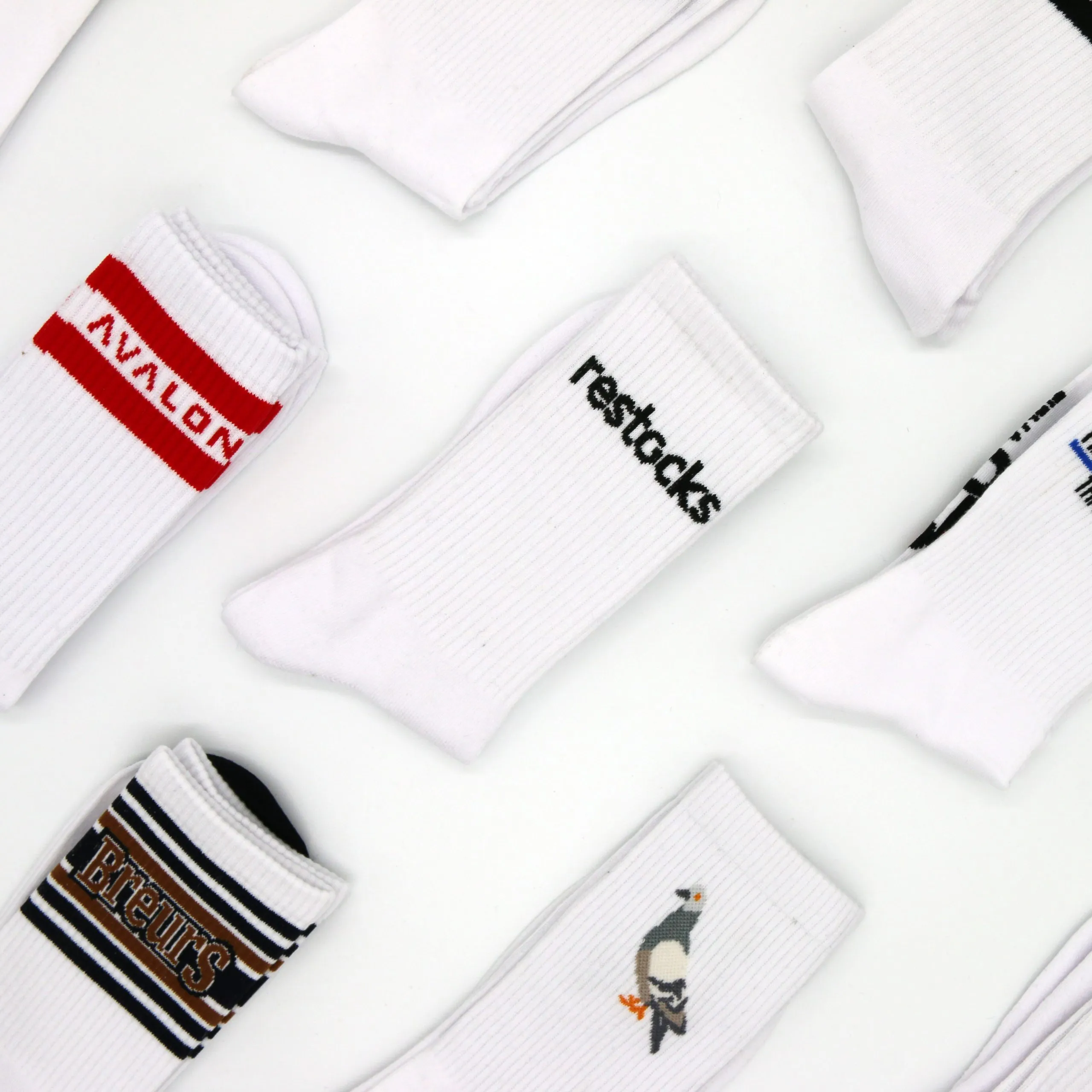 The question from Restocks was a simple one: can you make white sports socks with our logo? The answer was even simpler: yes! We created a clean, classic design of white sports socks with a pop-out black logo.